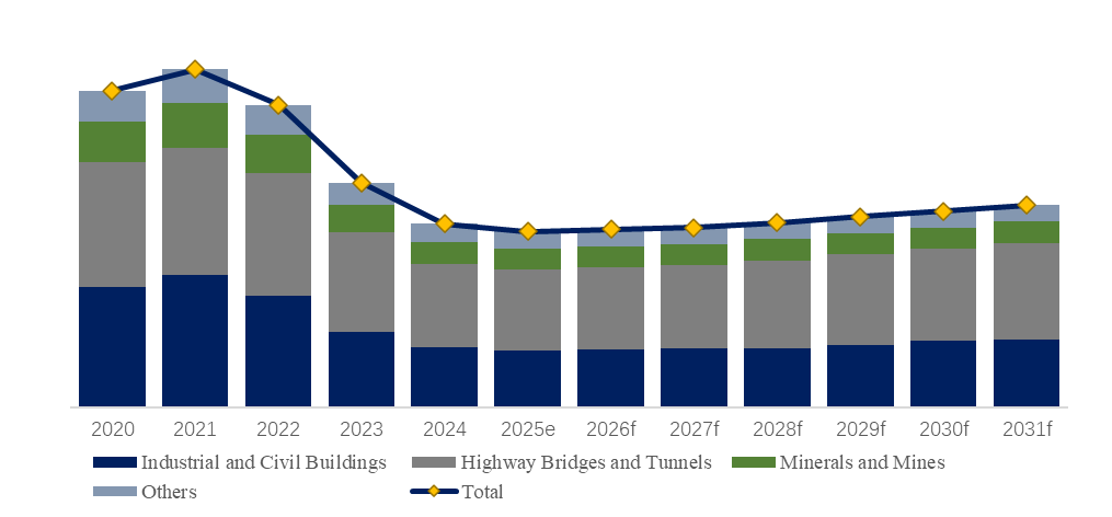 製品用途別では、高速道路橋梁・トンネルが最大の用途であり、45%のシェアを占めている。