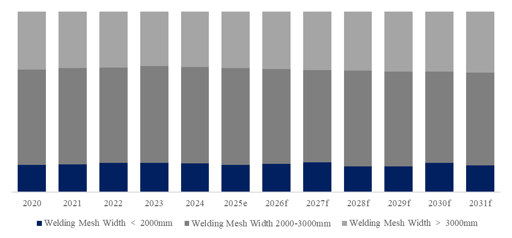 製品タイプ別では、溶接メッシュ幅2000-3000mmが最大のセグメントであり、53%のシェアを占めている。