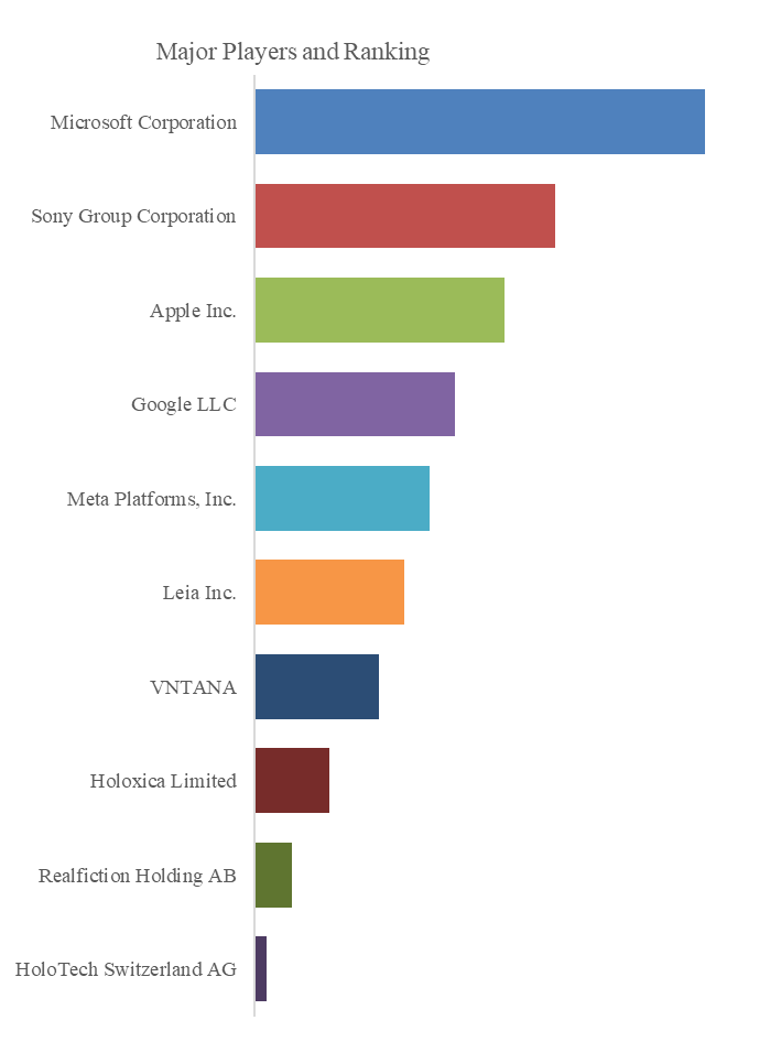 マイクロソフトは HoloLens およびエンタープライズ向けAIアシスタントで市場の約25%を占め、グローバルリーダーとしての地位を確立しています。ソニーは Spatial Reality Display を通じてプレミアムディスプレイ体験に注力し、約15%の市場シェアを獲得。Appleは Vision Pro の登場により12%のシェアを見込まれ、高い成長可能性を持っています。GoogleとMetaはそれぞれ約10%を占め、ARCoreやMeta Questを活用。Leia、VNTANA、Holoxicaなどの新興企業は小売・医療向けホログラフィックソリューションのニッチ市場を狙い、シェアは小さいものの技術革新における優位性を保持しています。