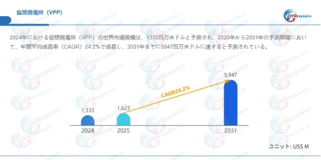 QYResearchが発表した新たな市場調査レポート「仮想発電所(VPP)―グローバル市場シェアとランキング、全体の売上と需要予測、2026~2032」によると、世界の仮想発電所(VPP)市場規模は2024年の約1333百万米ドルから2025年の1623百万米ドルへと順調に拡大すると見込まれ、予測期間中は年平均成長率(CAGR)24.2%で成長し、2031年には5947百万米ドルに達すると予測されている。