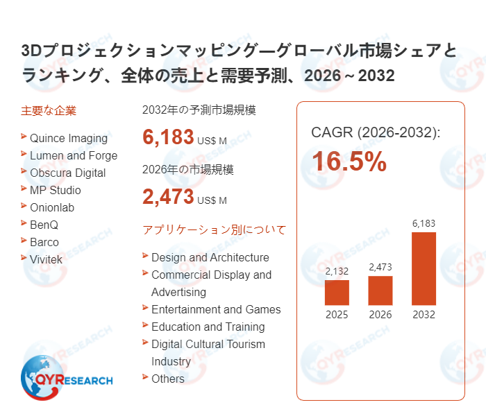 QYResearchが発表した新たな市場調査レポート「3Dプロジェクションマッピング―グローバル市場シェアとランキング、全体の売上と需要予測、2026~2032」によると、世界の3Dプロジェクションマッピング市場規模は2025年の約2132百万米ドルから2026年の2473百万米ドルへと順調に拡大すると見込まれ、予測期間中は年平均成長率(CAGR)16.5%で成長し、2032年には6183百万米ドルに達すると予測されている。