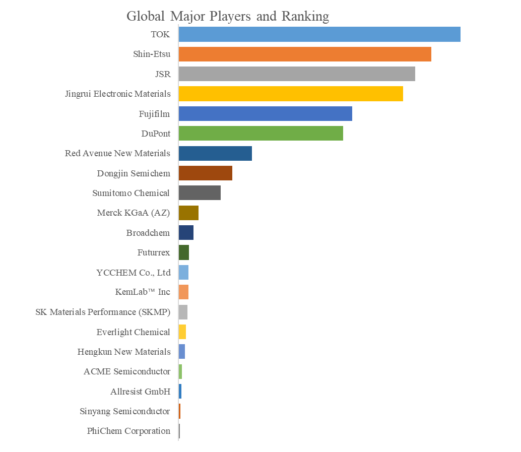QYResearchのトップ企業研究センターによると、半導体用フォトレジストの世界的な主要製造業者には、TOK、Shin-Etsu、JSR、Jingrui Electronic Materials、Fujifilm、DuPont、Dongjin Semichem、Red Avenue New Materials、Sumitomo Chemical、Merck KGaA (AZ)などが含まれている。2024年、世界のトップ10企業は売上の観点から約92.0%の市場シェアを持っていた。