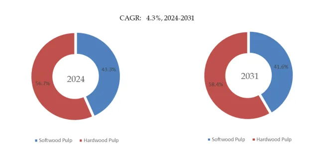 製品の種類別では、現在ハードウッドパルプが最大のセグメントを占めており、56.7%のシェアを占めています。