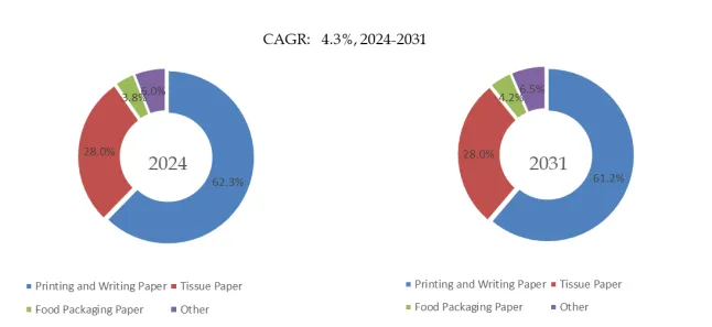 製品用途別では、現在、印刷用紙および筆記用紙が最大のセグメントを占め、62.3%のシェアを占めています。