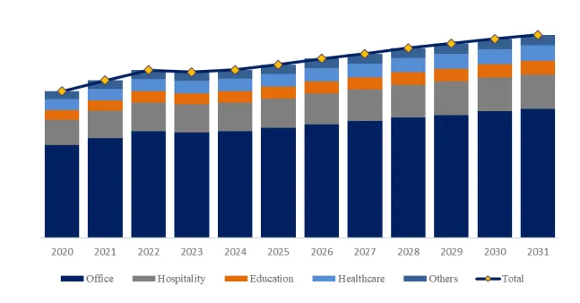 図:業務用テーブルとチェア、グローバル市場規模、用途別セグメント別