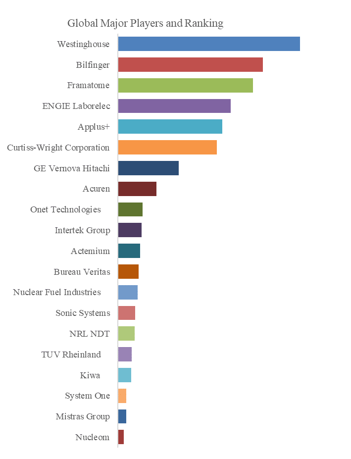 主要な市場プレイヤーにおいて、ウェスティングハウスは9.86%という圧倒的なシェアをリードしています。これは、同社が原子力エネルギー分野での数十年にわたる経験と統合されたサービス提供を背景にしています。その他の主要なプレイヤーには、ビルフィンガー、フラマトーム、ENGIE ラボレック、アプラス+が含まれます。これらの企業は、溶接検査、燃料集合体評価、寿命延長サービスにおける卓越した技術で知られています。さらに、Curtiss-Wright, GE Vernova Hitachi, Acuren, Onet Technologies, and Intertek Groupも、ニッチな市場セグメントに特化した専門知識を提供しています。