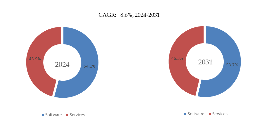 製品タイプ別では、現在ソフトウェアが最大のセグメントであり、54.1%のシェアを占めている。