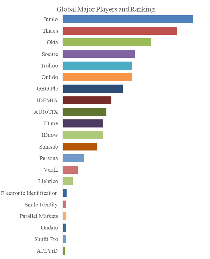 QYResearchトッププレイヤー調査センターによると、世界の主要な身元(ID)の検証メーカーには、Jumio、Thales、Okta、Socure、Trulioo、Onfido、GBG Plc、IDEMIA、AU10TIX、ID.meなどが含まれる。2024年、世界のトップ10企業は収益ベースで約51.0%のシェアを占めた。