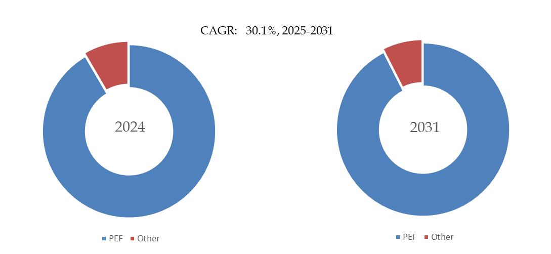 製品用途別では、現在PEFが最大のセグメントであり、91.6%のシェアを占めている。