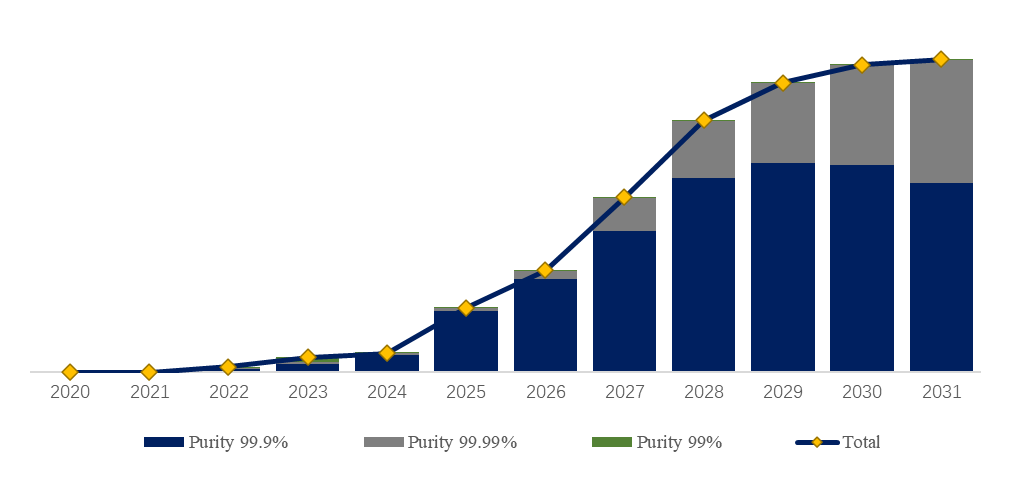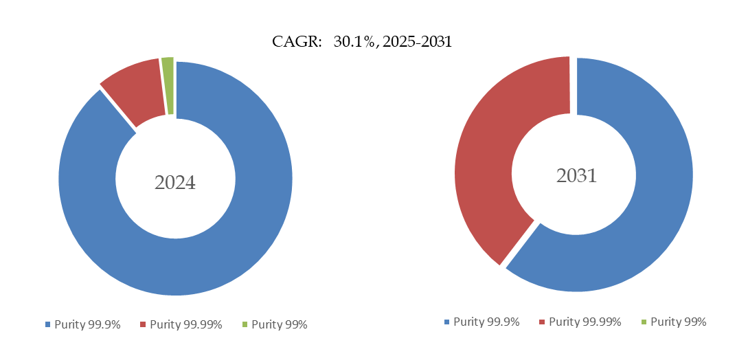 製品タイプ別では、現在純度99.9%が最大のセグメントであり、88.9%のシェアを占めている。