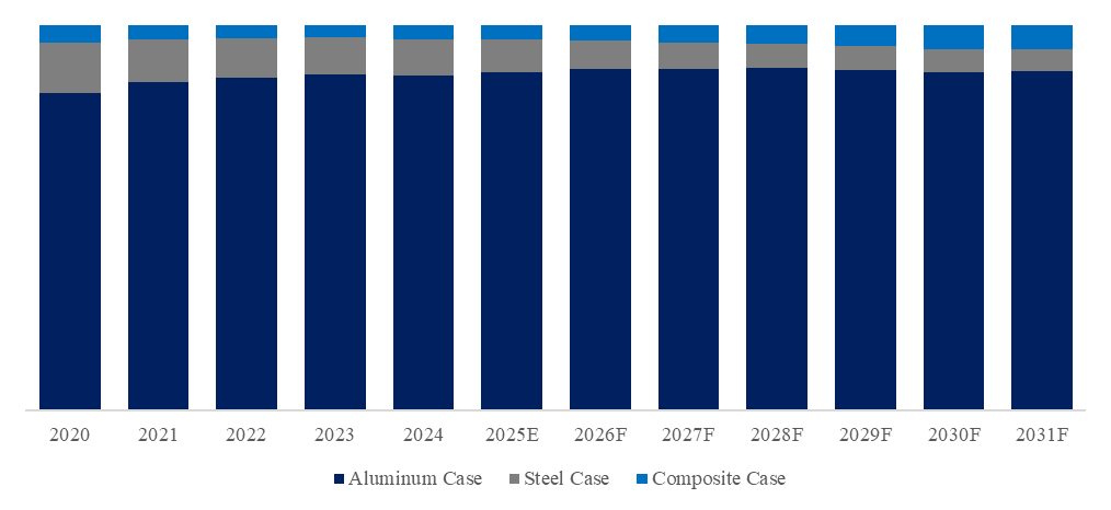 製品タイプ別では、現在アルミケースが最大のセグメントであり、86.9%のシェアを占めている。