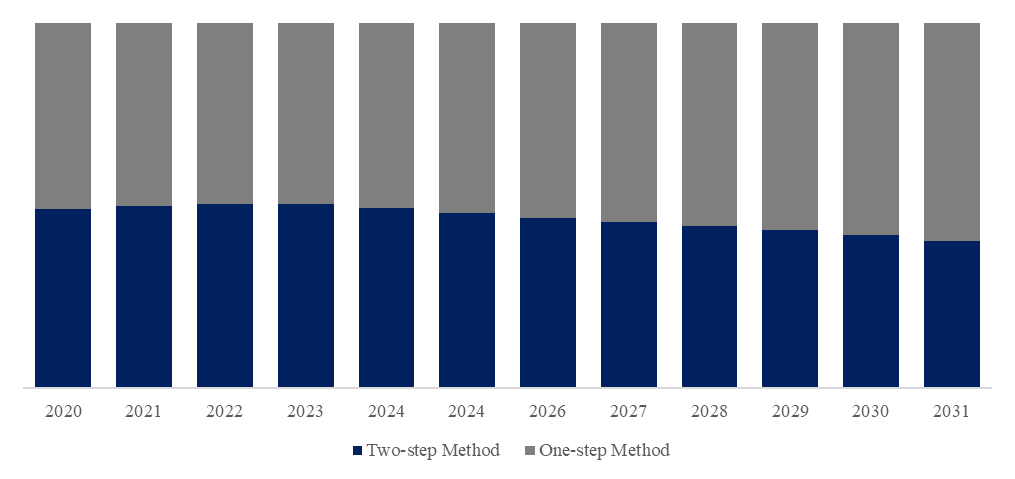 製品タイプ別では、現在ツーステップ法が最大のセグメントであり、97.0%のシェアを占めている。