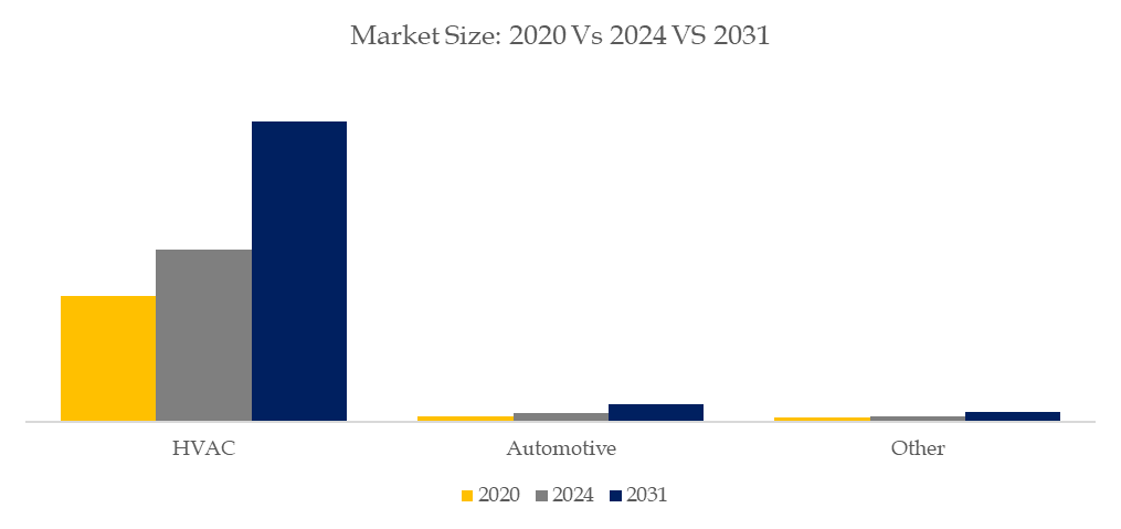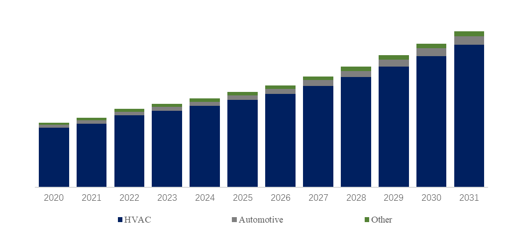 製品用途別では、現在HVACが最大のセグメントであり、91.8%のシェアを占めている。