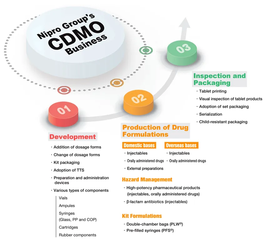 CDMO企業が提供するサービスには、製剤開発、分析サービス、混合、コーティング、加工、包装、シリアル化、出荷などが含まれます。CDMOはコンセプト段階から、あるいは完成済みの処方から対応可能で、前製剤開発・製剤開発サービスに加え、臨床試験や商業生産も提供します。