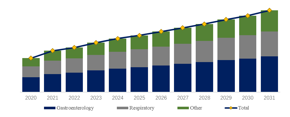 製品用途別では、現在消化器科が最大のセグメントであり、43.9%のシェアを占めている。