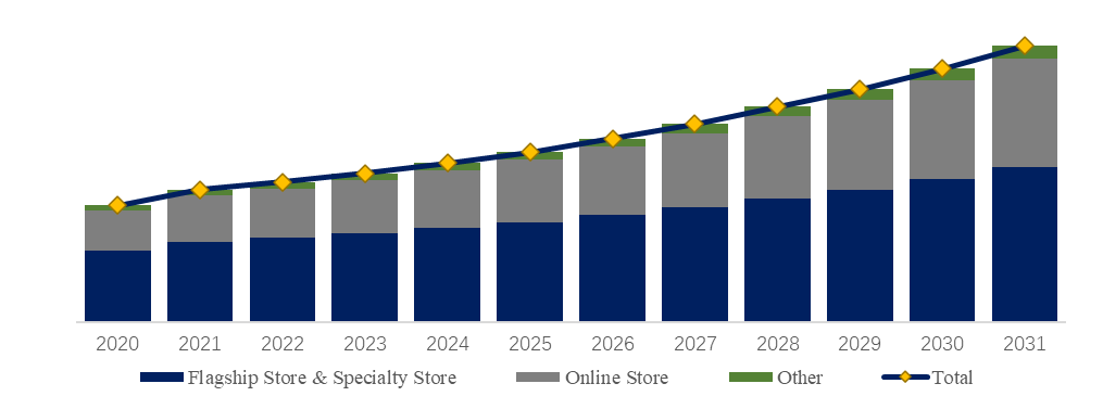 製品用途別では、現在フラッグシップストア・専門店が最大のセグメントであり、59.3%のシェアを占めている。
