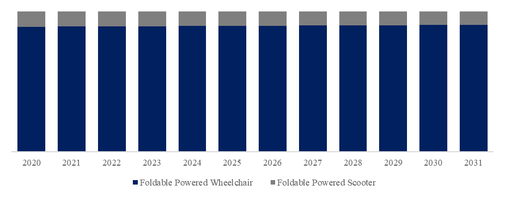製品タイプ別では、現在折りたたみ式電動車椅子が最大のセグメントであり、89.6%のシェアを占めている。