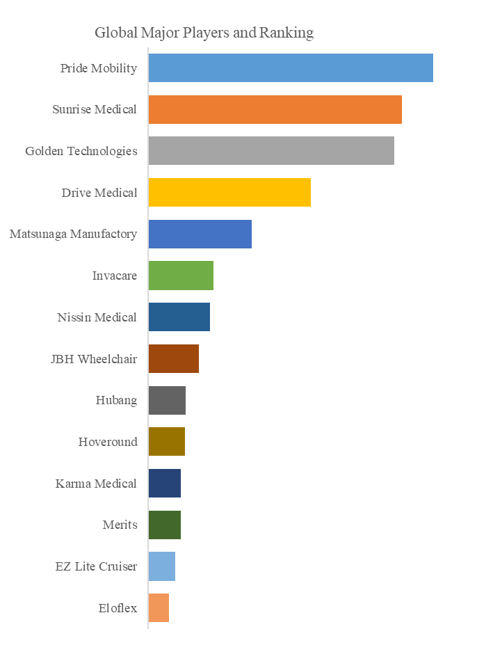 QYResearchトッププレイヤー調査センターによると、折りたたみ式電動車いす、折りたたみ式電動スクーターの世界的な主要メーカーにはPride Mobility, Sunrise Medical, Golden Technologies, Drive Medical, Matsunaga Manufactoryなどが含まれる。2024年、世界トップ5社の売上高シェアは約51.0%を占めた。