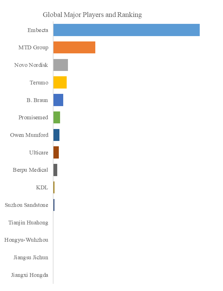 QYResearchトッププレイヤー調査センターによると、インスリンペン針の世界的な主要メーカーにはEmbecta, MTD Group, Novo Nordisk, Terumo, B. Braunなどが含まれる。2024年、世界トップ5社の売上高シェアは約84.0%を占めた。