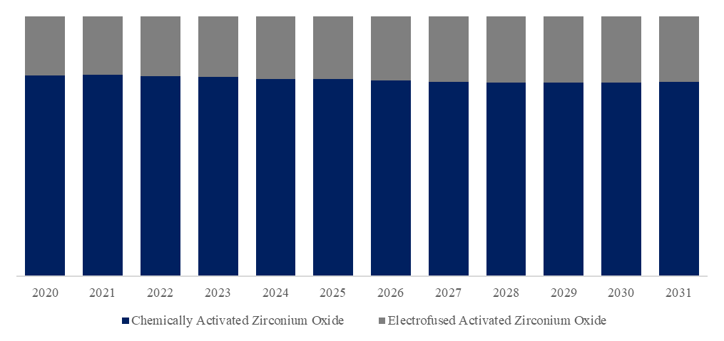 製品タイプ別では、現在化学活性酸化ジルコニウムが最大のセグメントであり、75.8%のシェアを占めている。