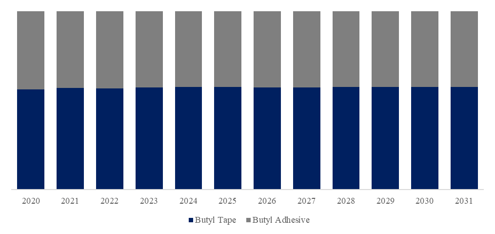 製品タイプ別では、現在ブチルテープが最大のセグメントであり、57.5%のシェアを占めている。