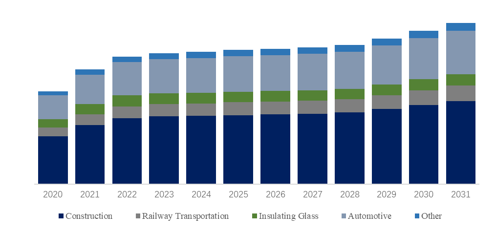 製品用途別では、現在建設分野が最大のセグメントであり、51.7%のシェアを占めている。