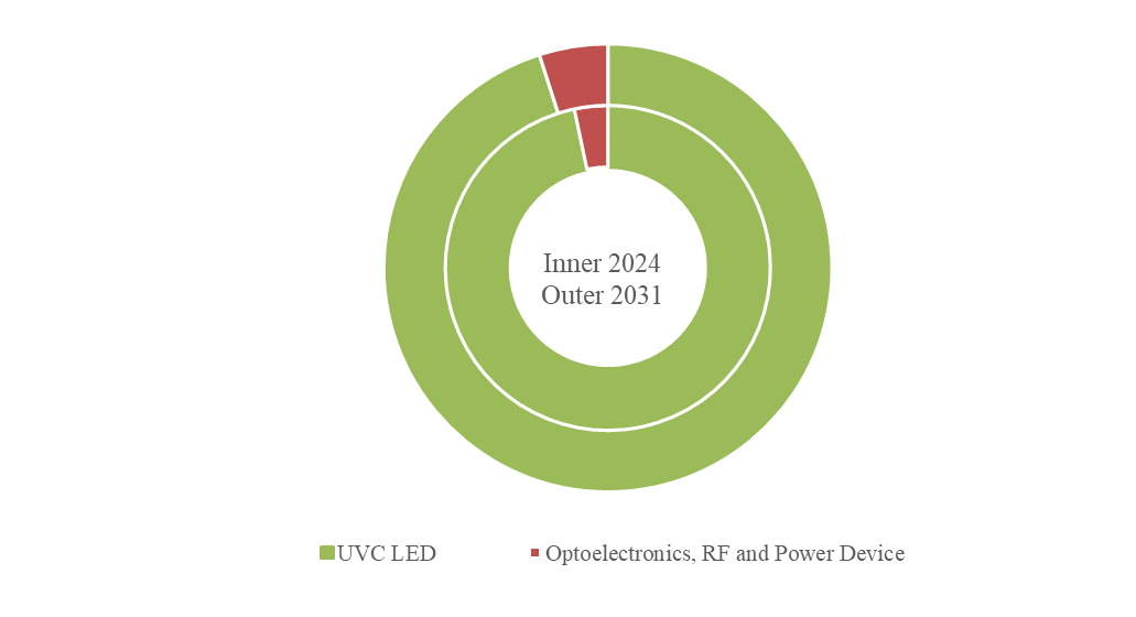 UVC-LEDは現時点で本市場の大部分を占めており、2024年におけるUVC-LED関連の消費額は約42.03百万米ドルに達している。今後も高い成長を維持すると見込まれており、短期から中期にかけての需要は、主に消毒・浄化・公衆衛生分野の応用によって牽引されることが予測される。一方で、オプトエレクトロニクス、RFおよびパワー分野は現時点では市場規模が小さいものの、コストやプロセス技術におけるさらなるブレークスルーが実現すれば、長期的には「爆発的」な成長機会を有すると考えられる。
