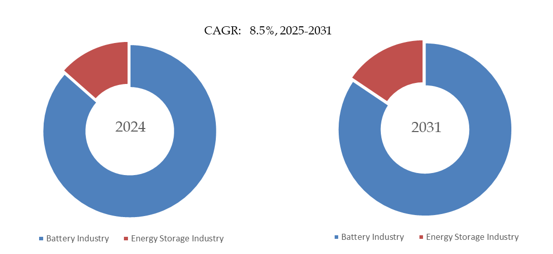 製品用途別では、現在バッテリー産業が最大のセグメントであり、86.5%のシェアを占めている。