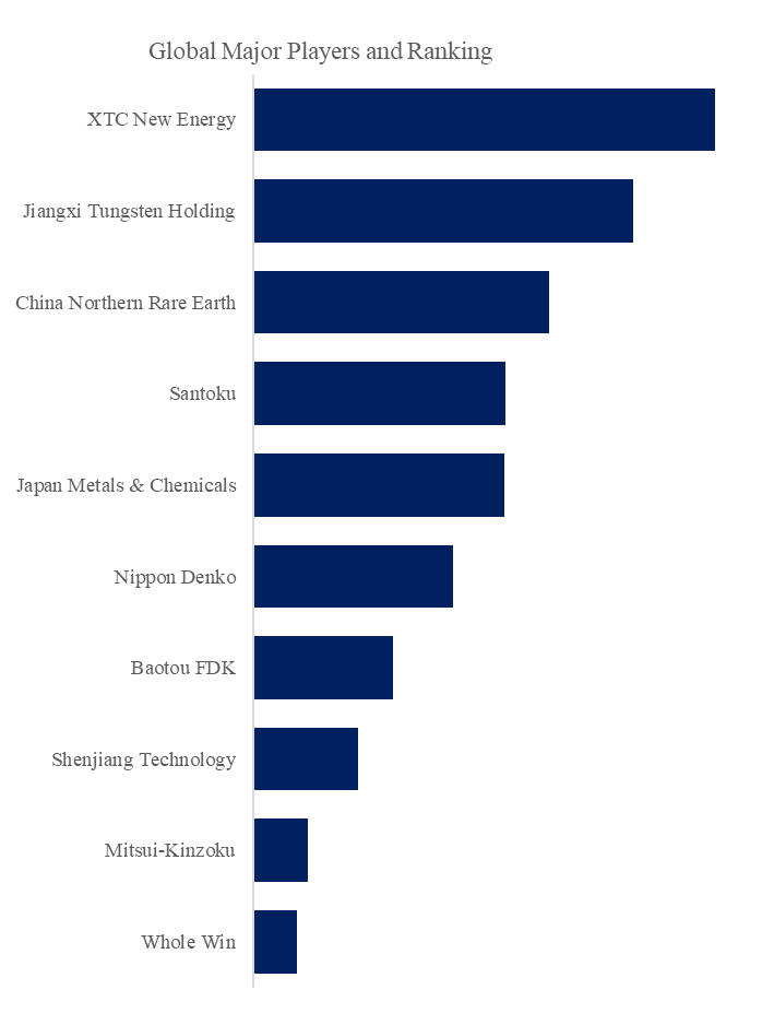 QYResearchトッププレイヤー調査センターによると、水素吸蔵合金の世界の主要メーカーには、XTC New Energy, Jiangxi Tungsten Holding, China Northern Rare Earth, Santoku, Japan Metals & Chemicals, Nippon Denko, Baotou FDK, Shenjiang Technology, Mitsui-Kinzoku, Whole Winなどが含まれる。2024年、世界のトップ5メーカーの売上高シェアは約53.0%を占めた。