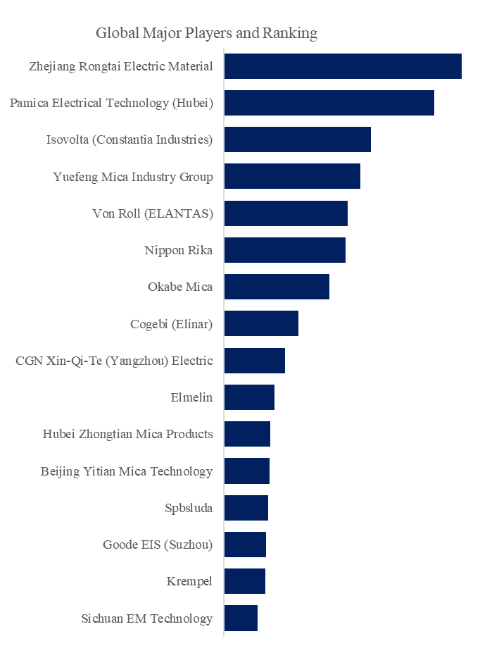 QYResearchトッププレイヤー調査センターによると、世界のマイカ絶縁体の主要メーカーには、Zhejiang Rongtai Electric Material, Pamica Electrical Technology (Hubei), Isovolta (Constantia Industries), Yuefeng Mica Industry Group, Von Roll (ELANTAS), Nippon Rika, Okabe Mica, Cogebi (Elinar), CGN Xin-Qi-Te (Yangzhou) Electric, Elmelinなどが挙げられる。2024年、世界トップ10メーカーの売上高シェアは約42.0%を占めた。